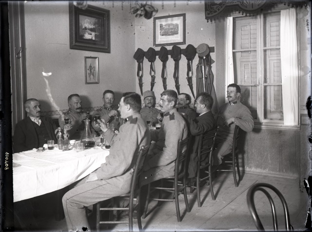 Soldati austriaci ad Aurisina mentre brindano seduti a tavola.