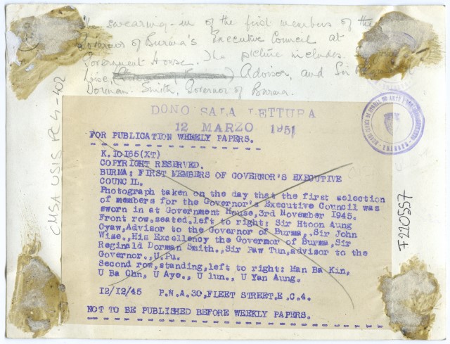 Membri del Consiglio Esecutivo del Governo a Burma. La foto mostra fra gli altri: Sir John Wise, il Consigliere e Sir Reginald Dorman Smith, il governatore di Birmania