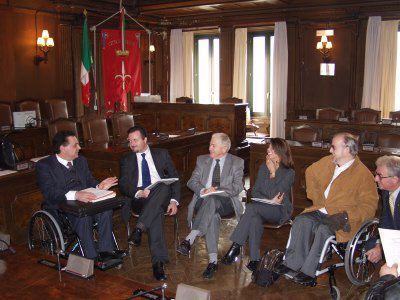 L'assessore comunale Claudia D'Ambrosio, il presidente del Consiglio comunale Bruno Sulli ed il Vicepresidente del Consiglio regionale del FVG Giulio Staffieri, durante l'incontro con il presidente Giuseppe Trieste ed altri rappresentanti del Fondo Italiano Abbattimento Barriere Architettoniche ,