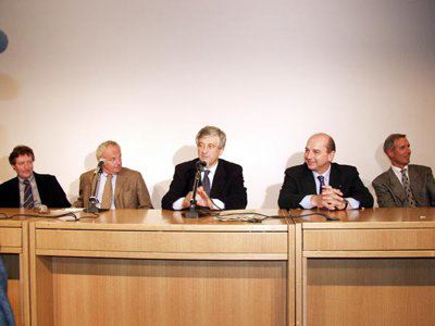 Presenti sul palco nell'auditorium del Museo Revoltella il sindaco Dipiazza, i figli Bruno e Tito, l'onorevole Gianni Rivera, l'allenatore Cesare Maldini, il giornalista Bruno Pizzul, il presidente della Camera di Commercio Paoletti