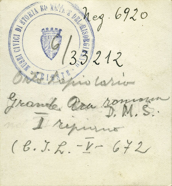 Ara romana con base modanata solo parzialmente conservata, spezzata in corrispondenza degli angoli. La lapide reca l'iscrizione: D. M. S. L'ara è esposta nell'Orto Lapidario del Museo di Storia ed Arte di Trieste.