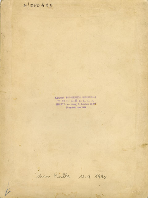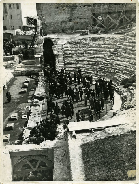 Il teatro romano di Trieste a scavo ultimato aperto alla visita della cittadinanza. La foto non è datata, tuttavia va riferita a un momento successivo all'inaugurazione del monumento, avvenuta il 21 aprile 1938, in occasione della quale è noto che il teatro fu fatto visitare dal pubblico.