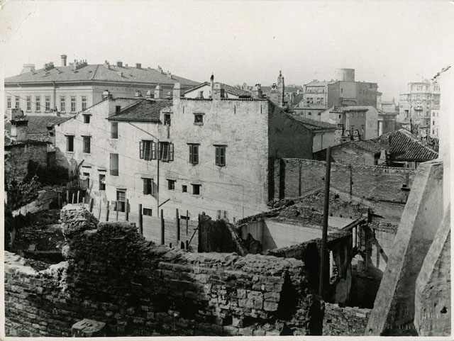 Prime demolizioni degli edifici sorti sui resti del teatro romano in Cittavecchia nelle zone di Riborgo e Donota. La foto è stata scattata da via Donota e inquadra le prime operazioni di sbancamento intraprese nel 1937. In primo piano, in basso, è visibile il tratto del muro perimetrale (tratto sud-ovest) della cavea emerso nel corso dei sondaggi condotti nel 1934 a seguito dell'approvazione del piano regolatore. Oltre il muro, si sta procedendo alla demolizione delle case costruite nell'area anticamente occupata dalla cavea del teatro. Lo sbancamento della zona, condotto in due soli anni, dal 1937 al 1938, permetterà di mettere in luce il monumento nella sua intera estensione. La presentazione ufficiale del teatro alla cittadinanza avverrà il 21 aprile del 1938 mentre l'inaugurazione ufficiale sarà celebrata dal duce il 18 settembre del 1938.