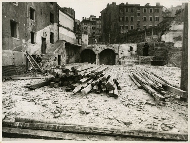 Demolizione degli edifici sorti sui resti del teatro romano nelle zone di Riborgo e Donota in Cittavecchia. La foto, scattata nel 1937, anno in cui iniziò lo sbancamento sistematico dell'area occupata dal monumento, riprende il settore interessato dall'estremità occidentale della cavea del teatro. Le operazioni di scavo, durate due soli anni, dal 1937 al 1938, permisero di mettere in luce il monumento antico nella sua intera estensione.