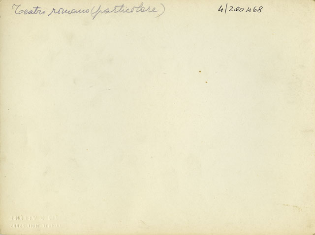 Scavo del teatro romano di Trieste./pLa foto inquadra il particolare del muro del frontescena nel tratto corrispondente all'apertura centrale, la porta regia, che si apriva sulla destra del pilastro. Lo scavo ha messo in luce la porzione inferiore del fondale scenico caratterizzato da un profilo a nicchie definito da una base marmorea modanata sui cui si imposta un nucleo interno in muratura. La buona conservazione dei resti ha consentito la ricostruzione pressoché completa del frontescena: al centro vi era un'esedra semicircolare dove si apriva la valva regia mentre ai lati trovavano posto due esedre rettangolari all'interno delle quali vi erano altre due aperture, le valvae hospitales. All'interno delle esedre, ai lati delle porte, erano collocate delle basi che forse sostenevano colonne posizionate ai lati degli accessi. Erano probabilmente destinate a impreziosire il frontescena le state rinvenute nel corso dello scavo, molte delle quali trovate proprio davanti alla scena, nell'iposcenio.