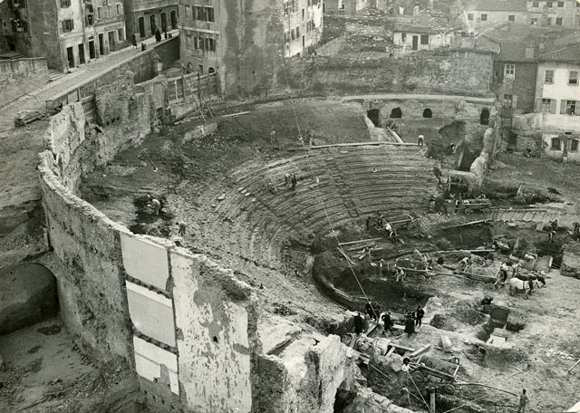 Il teatro romano in corso di scavo visto da sud-est. La foto documenta il procedere del cantiere: del monumento è stato individuato il muro perimetrale, che si conserva per ampi tratti in elevato, e la maggior parte della gradinata della cavea, in corrispondenza della quale continuano le operazioni di scavo. Lo sbancamento procede anche sull'orchestra, dove si sta lavorando per raggiungere il piano di fondo. Davanti all'orchestra l'interro moderno copre ancora la zona della scena, di cui è stato intercettato solo qualche elemento del muro di fondo.