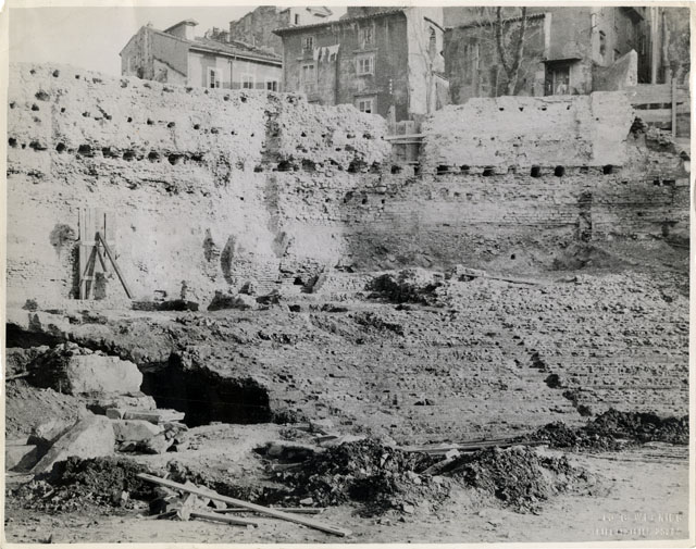 Veduta della porzione nord-est della cavea del teatro romano in corso di scavo./pLa foto inquadra il muro perimetrale del monumento, che si conserva per buona parte in alzato, e il tratto della gradinata liberato dai riporti moderni. L'approfondimento sta procedendo a liberare la pozione inferiore dell'ima cavea, ancora interrata.