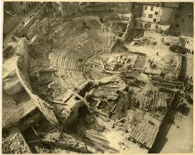 Il teatro romano in corso di scavo. La foto documenta il procedere del cantiere: si vede che è stata portata alla luce la cavea con le gradinate fino all'orchestra mentre la zona occupata dalla scena è in fase di scavo.