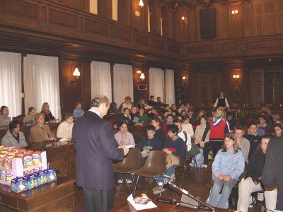 Il sindaco Roberto Dipiazza in piedi nella sala consiglio affollata di studenti