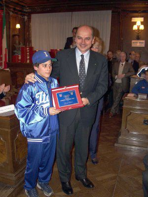 Nella sala del Consiglio Comunale il sindaco Roberto Dipiazza consegna il premio ad un giovane atleta azzurro, i giocatori nazionali di pallamano di Trieste, Irene Camber e Nino Benvenuti