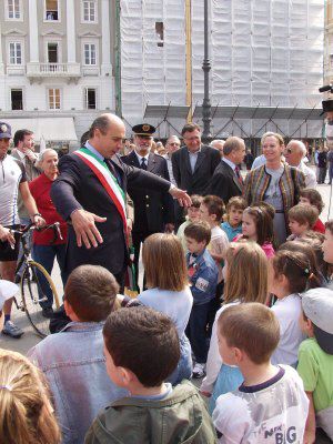 Roberto Dipiazza, sindaco intrattiene i bambini che assistevano all'incontro con i ciclisti della polizia in piazza dell'Unita' d'Italia : Trieste : 2002