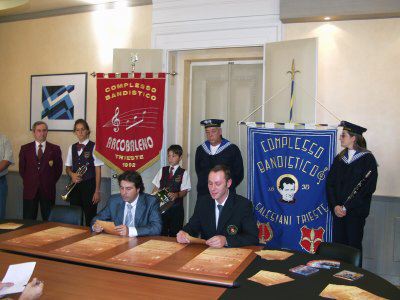 L'assessore comunale Maurizio Bucci con il presidente della sezione di Trieste dell'Associazione nazionale delle bande italiane autonome (Anbima) Andrea Roversi. Presentazione tenuta a Palazzo Carciotti