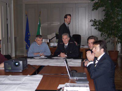 L'assessore comunale Maurizio Bucci ed il consigliere comunale Paolo Rovis durante la presentazione del Piano Neve tenuta nella sala riunioni dell'assessorato in via Genova 6