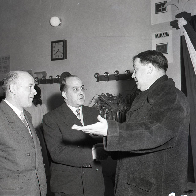 Oltre 700 bambini di eta inferiore ai 12 anni, profughi giuliano-dalmati, appartenenti alle classi piu indigenti, partecipano ad un pranzo natalizio offerto dal locale Ente organizzatore dell'Amministrazione per gli aiuti internazionali, nei locali della mensa comunale di via Gambini