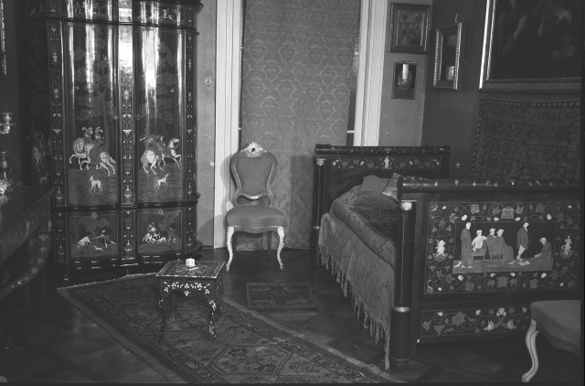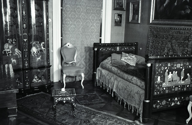 La splendida camera da letto di Draga Obrenovic, regina di Serbia, moglie del re Alessandro, composta da mobili olandesi intarsiati d'avorio. Draga e Alessandro, convolati a nozze nel 1900, furono assassinati la notte del 10 giugno 1903, proprio in questo letto: una congiura di palazzo pose fine alla dinastia degli Obrenovic, per insediare sul trono Pietro Karageorgevic. La camera appartenne a una nobile famiglia triestina e fu poi venduta a un celebre antiquario che la riallesti in una villa di viale Terza Armata, dove fu fotografata.