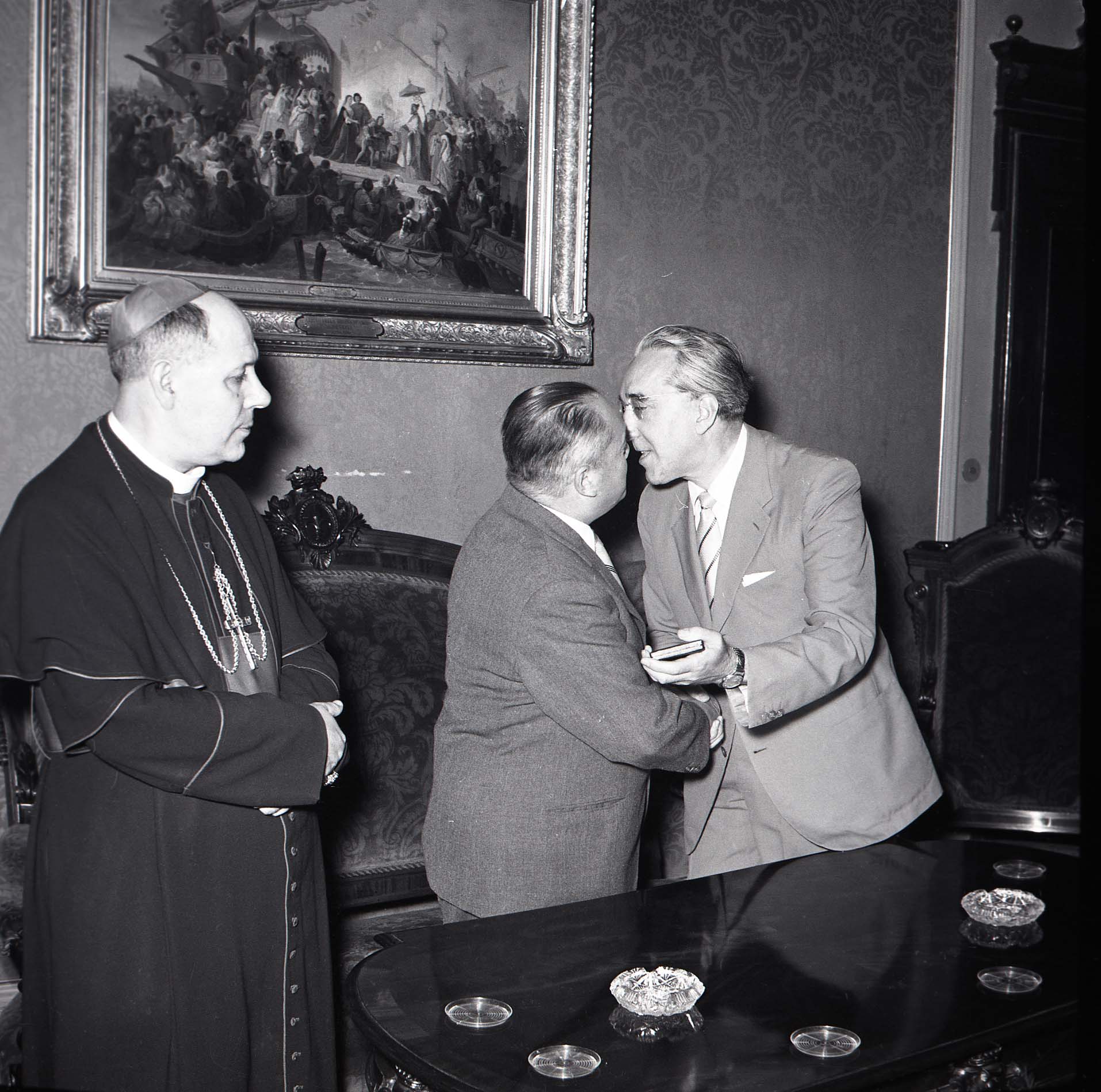 Congedo in forma ufficiale del dott. Renato Timeus, dal 1914 funzionario dell'amministrazione comunale di Trieste alla presenza del segretario generale del Comune Sacchi, del prof. Sciolis, del vescovo Santin e dell'ing. Visentin (Da: Rivista mensile della citta di Trieste, 10.9.1953)