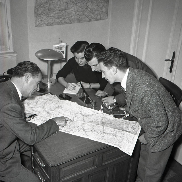 Servizio dedicato al personale dell'UTAT, agenzia di viaggi: gli impiegati posano per la fotografia, agli sportelli e negli uffici. Sulle lastre la vetrina dell'agenzia ricorda il ventennale di attività