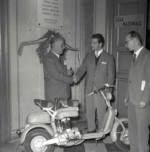 Il prof. Palin, presidente della lega Nazionale, riceve da Sergio Grandi, amministratore della Filotecnica Giuliana, commissionaria per Trieste della Innocenti, La Lambretta che la casa produttrice di moto ha donato al sodalizio. Testo tratto da Le ultime notizie, dd. 25.10.1954