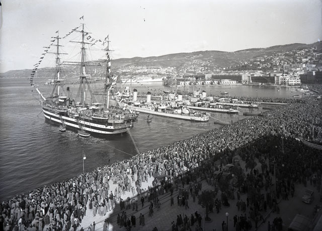 Parata militare sulle rive. Sullo sfondo gli incrociatori Duca degli Abruzzi e Montecuccoli, il cacciatorpediniere Artigliere, le torpediniere Libra e Cassiopea, e la nave scuola Amerigo Vespucci.