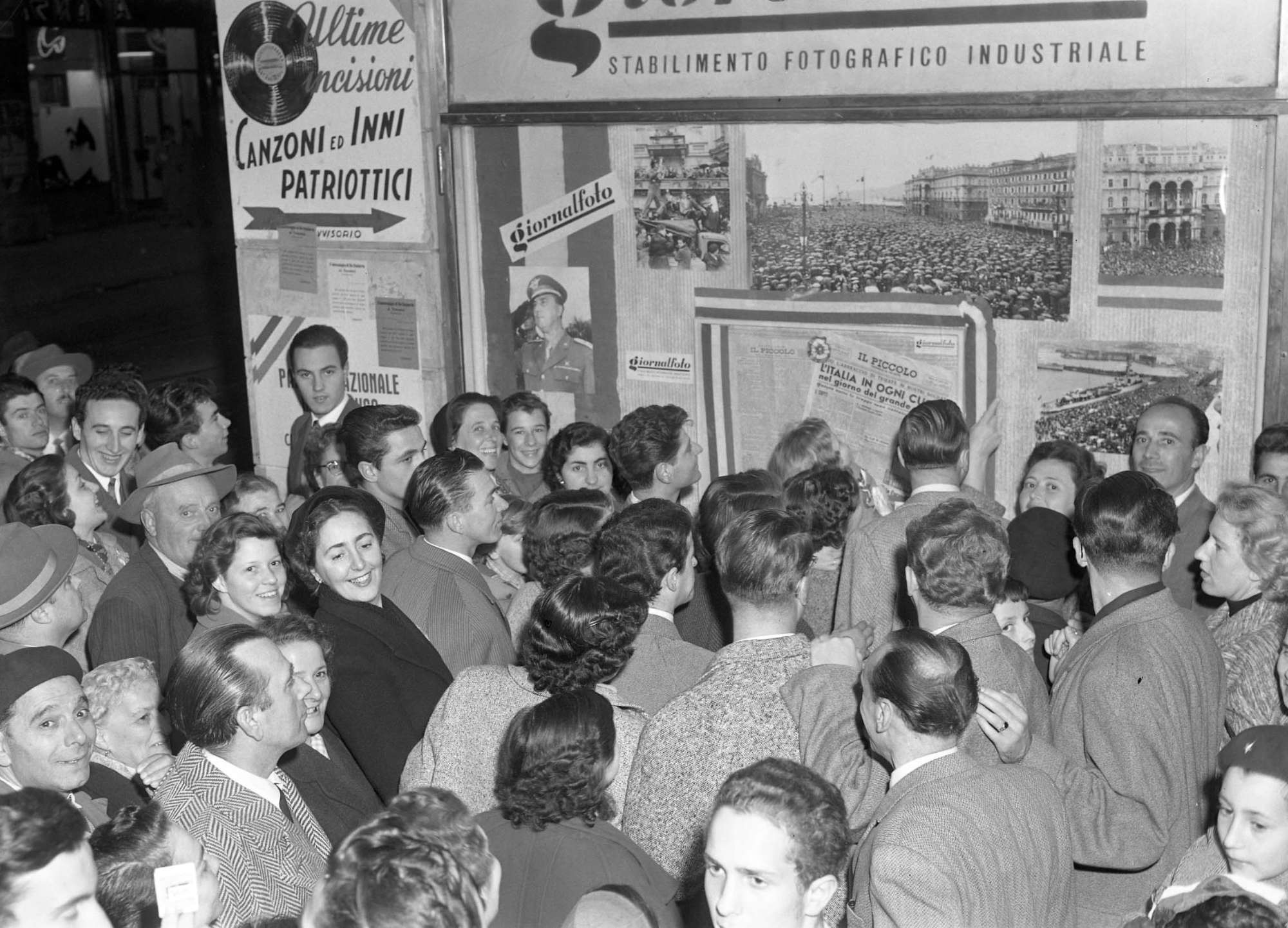 In Galleria Rossoni, la gente si accalca davanti alle vetrine di Giornalfoto che espongono le fotografie degli avvenimenti del giorno precedente, con l'arrivo delle truppe italiane a Trieste.