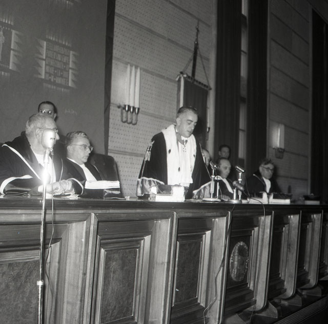 Alla presenza delle massime autorità civili, militari e religiose della provincia, il rettore Ambrosino apre ufficialmente nell'aula magna dell'Università il nuovo anno accademico. Ospiti d'onore il prof. Ardito Desio e gli altri quattro componenti del gruppo scientifico che parteciparono alla spedizione italiana sul K2. Il discorso inaugurale è tenuto dal prof. Antonio Marussi, capo del gruppo scientifico (da: Trieste 1900-1999. Cent'anni di storia, v. 6, p. 301) Il tribuno degli studenti Ninilo Lo Martire ricorda nel suo intervento gli studenti caduti in tutte le guerre.
