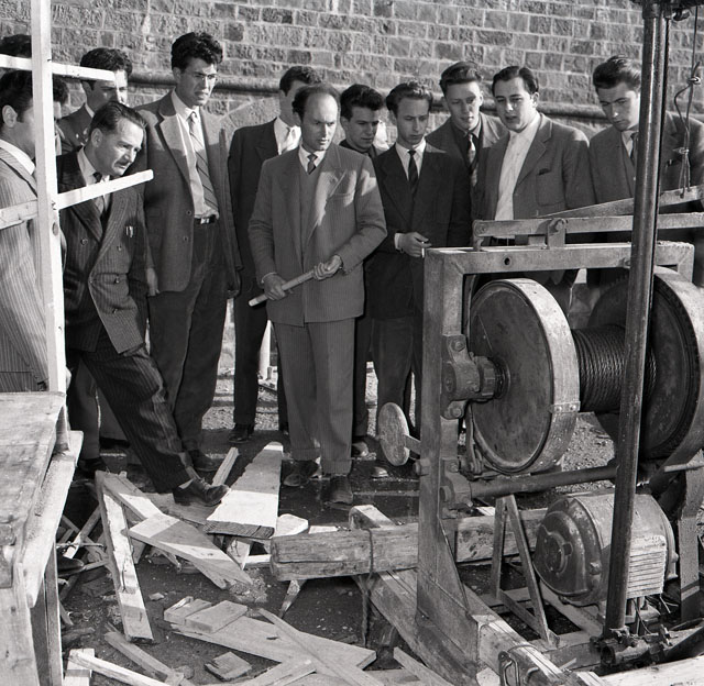 Gli studenti dell'Istituto tecnico industriale Alessandro Volta visitano la sede provinciale INAIL, di via del Teatro Romano, in costruzione. L'edificio, concluso nel 1957, è opera dell'arch. Romano Boico.