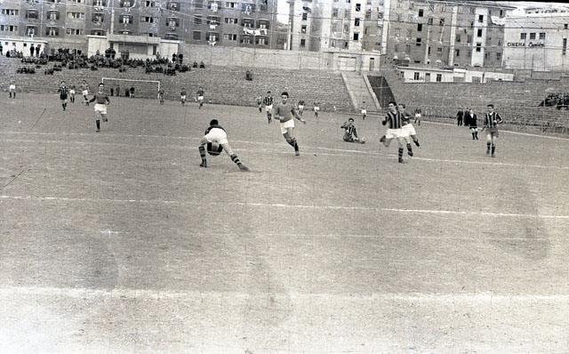 Sullo sfondo del ritratto della squadra dei calciatori si intravede l'edificio recante l'insegna del Cinema Lumiére di via Flavia