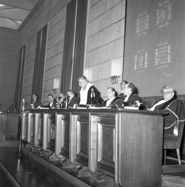 Alla presenza delle massime autorita' civili, militari e religiose della provincia, il rettore Ambrosino apre ufficialmente nell'aula magna dell'Universita' il nuovo anno accademico. Ospiti d'onore sono il prof. Ardito Desio, che guido' la spedizione italiana al K2 e gli altri quattro componenti il gruppo scientifico. Nella sua relazione il rettore presenta alcuni interessanti dati riguardanti l'ateneo nel passato anno accademico: 2.543 gli studenti iscritti (di cui 37 stranieri), 251 corsi di insegnamento, 3.845 esami di profitto sostenuti e 189 laureati. Il discorso inaugurale viene tenuto dal prof. Antonio Marussi, capo del gruppo scientifico della spedizione italiana sul K2 (tratto da: Trieste 1900-1999. Cent'anni di storia)