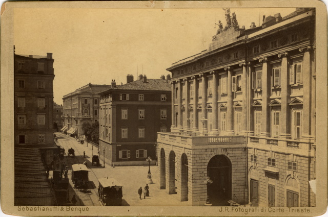 Sulla destra, in sequenza: il Palazzo del Lloyd Austriaco, il giardino di Piazza Grande, scomparso nel 1919, e la vecchia sede della Luogotenenza, demolita nel 1904. In primo piano il teatro eretto nel 1801 col nome Teatro Nuovo, poi ribattezzato nel 1819 Grande, nel 1861 Comunale e, il 27 gennaio 1901, il giorno stesso della morte del compositore, Verdi. Sulla sinistra si vedono i tramway a cavalli su rotaia, servizio cessato nel 1900