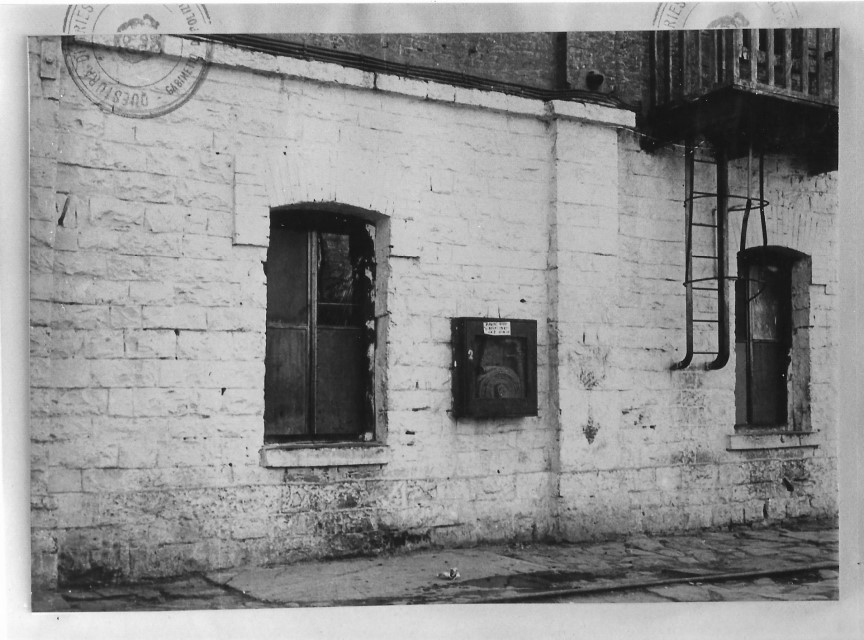 Riproduzione di una fotografia della facciata di un edificio all'interno della Risiera di San Sabba, sul recto il timbro della Polizia, probabile materiale del Gabinetto di Polizia Scientifica della Questura di Trieste