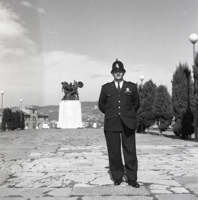 Fotografi Marcello Bari e Bruno Kerbavcich in moto e vigile urbano a San Giusto