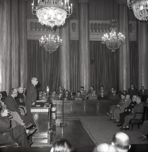 Il sottosegretario al Tesoro, Antonio Maxia (4/3/1904 - 15/4/1962), nella sala maggiore della Camera di commercio, insedia la commissione per i danni di guerra. Borsatti, erroneamente, lo definisce ministro