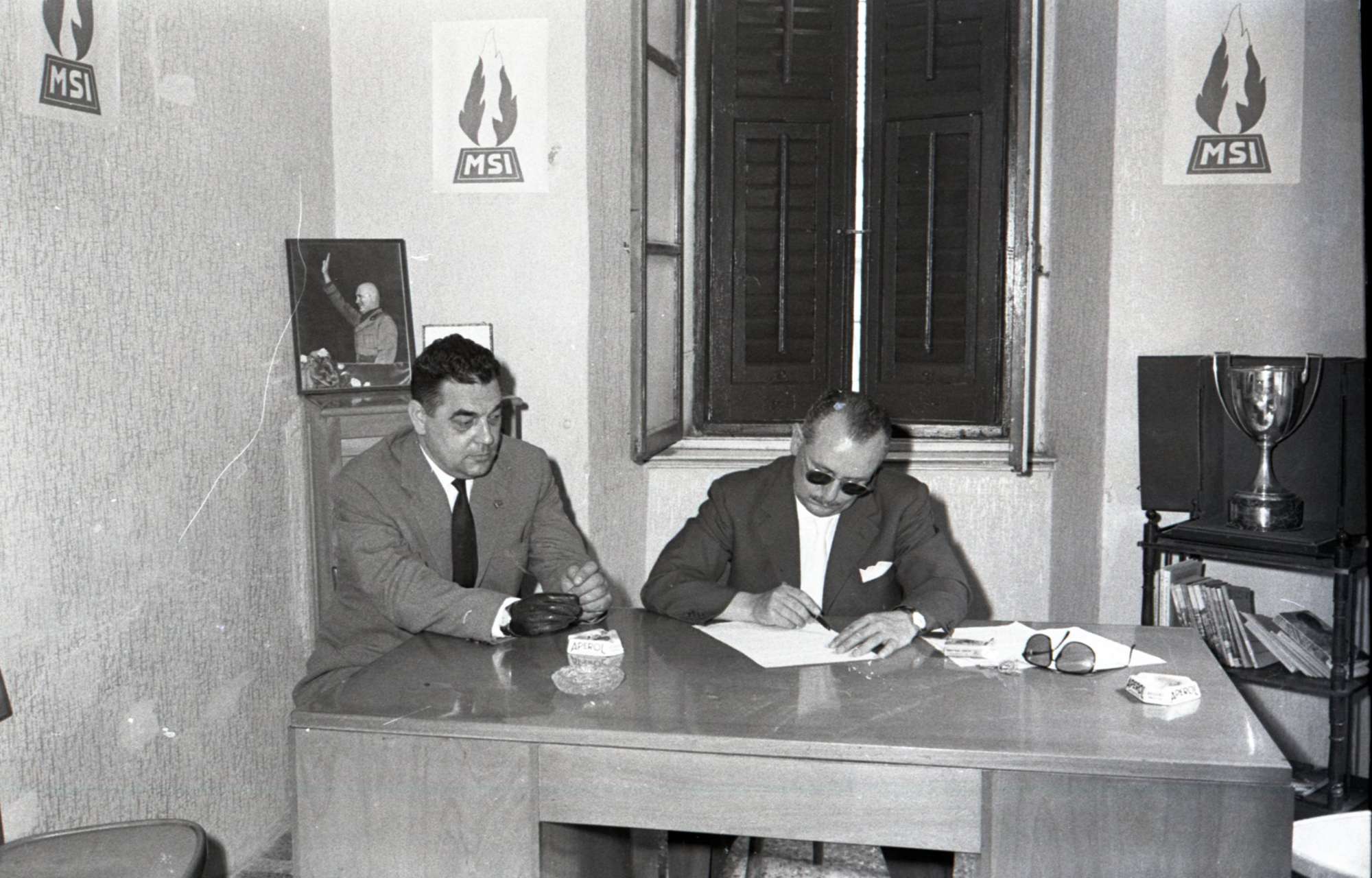 Sullo sfondo, il ritratto di Benito Mussolini