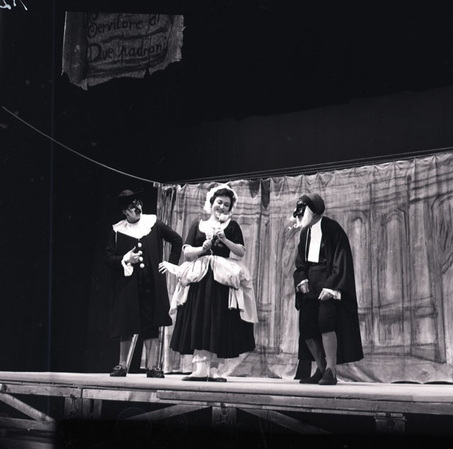 Gli allievi della scuola di recitazione del Teatro Nuovo offrono al pubblico, dopo il saggio di fine d'anno, tre repliche straordinarie dello spettacolo tratto dalla commedia di Carlo Goldoni "Arlecchino servitore di due padroni", con l'attore Giorgio Valletta, per la regia di Fulvio Tolusso. Il Piccolo Sera 08.07.1960