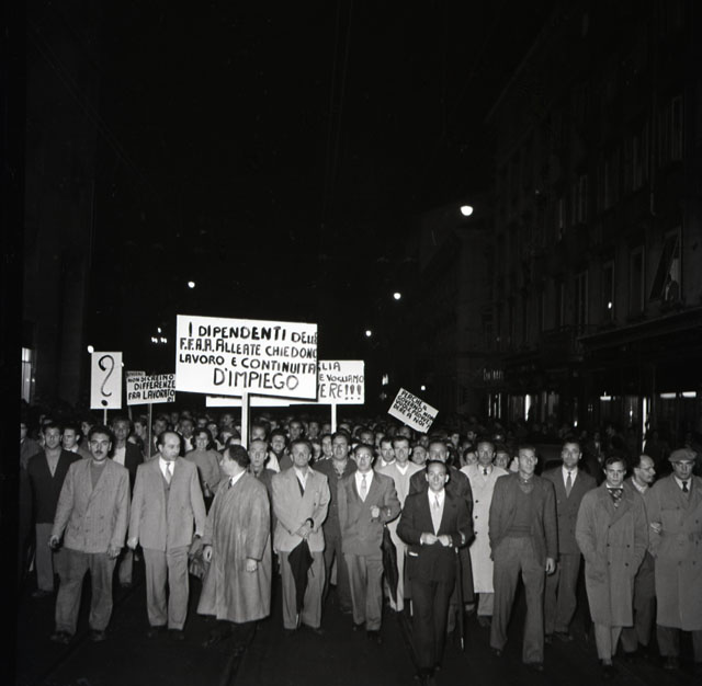 Corteo per le vie cittadine con cartelli di protesta; in vista i cartelli: I dipendenti delle Forze Alleate chiedono lavoro e continuità d'impiego; Siamo capi famiglia che abbiamo lavorato e vogliamo lavorare per vivere; Non si creino differenze fra lavoratori