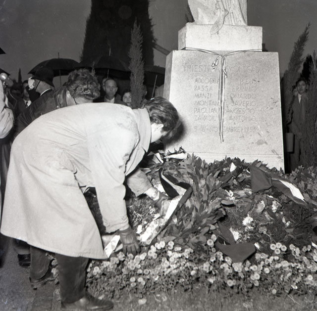 Il monumento ai Caduti è dedicato ai tredici triestini: Claudio Burla, Carlo Murra, Graziano Novelli, Mirano Sanzin e GIovanna Drassich caduti il 5 maggio 1945 in Corso, Emilio Beltramini caduto il 3 novembre 1945, Alino Conestabo caduto durante una manifestazione il 15 settembre 1945, e i sei di novembre 1953, Pietro Addobbati, Erminio Bassa, Nardino Manzi, Saverio Montano, Francesco Paglia e Antonio Zavadil. Testo tratto da Il Piccolo, 10.11.1954