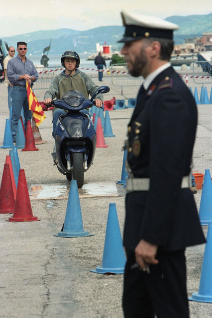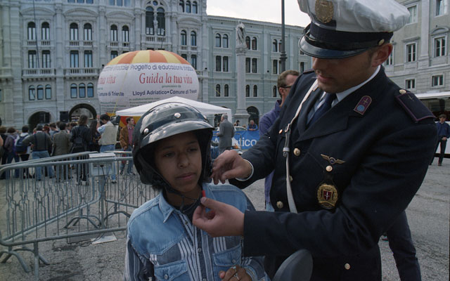 Piazza Unità, bambini, giovani, motorini, Lloyd Adriatico, vigili urbani, "Guida la tua vita", municipio, casco, breakdance.