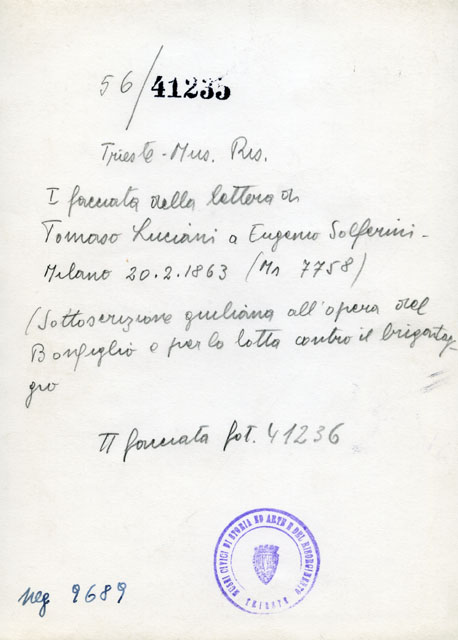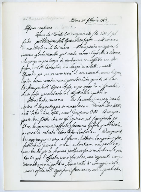 Riproduzione della lettare di Tomaso Luciani a Eugenio Solferini per la sottoscrizione della lotta contro il brigantaggio