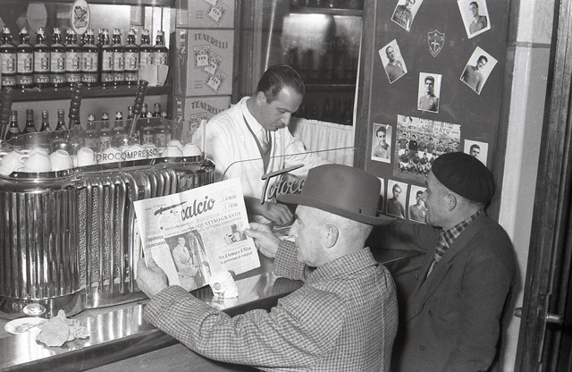 Sul bancone si nota la macchina del caffè mentre sulla mensola sono presenti le bottiglie di Bianco Sarti