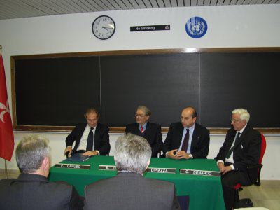 Il sindaco Roberto Dipiazza con direttore ad interim del Centro di fisica Erio Tosatti e l'ambasciatore italiano all'Unesco di Parigi Francesco Caruso.