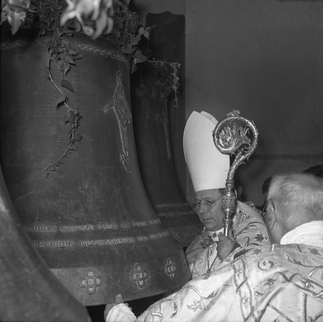 Quarantasette nuove campane, in sostituzione di quelle requisite o distrutte durante la guerra, vengono benedette dal vescovo Santin davanti alla Chiesa di Sant'Antonio Taumaturgo