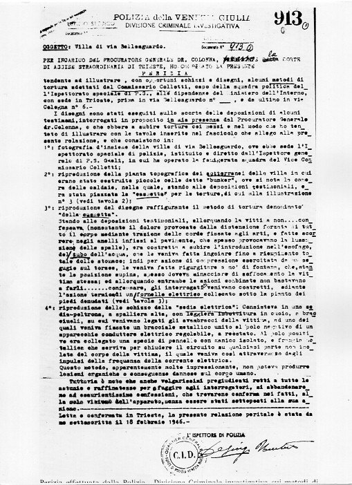 Riproduzione del rapporto dattiloscritto della Polizia Divisione Criminale e Investigativa riguardante la banda del Commissario Collotti operante nella Villa di via Bellosguardo durante la guerra