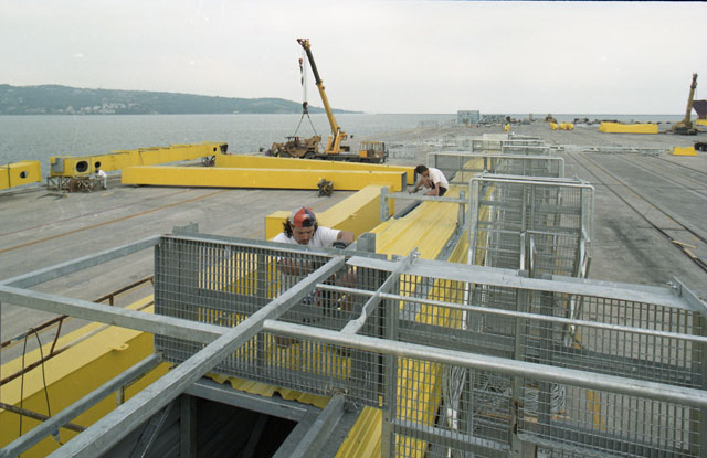 Molo VII, gru posa in opera, operai, lavoro, ferrovia, treno, container.