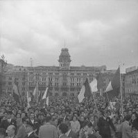 All'annuncio della firma del Memorandum d'intesa a Londra, diffuso dal generale Winterton dai microfoni di Radio Trieste, la folla si riversa in piazza Unita' d'Italia per assistere alla cerimonia dell'alzabandiera. Cortei di studenti e cittadini percorrono le vie del centro raggiungendo il monumento a Domenico Rossetti e il colle di San Giusto, dove rendono omaggio ai caduti.