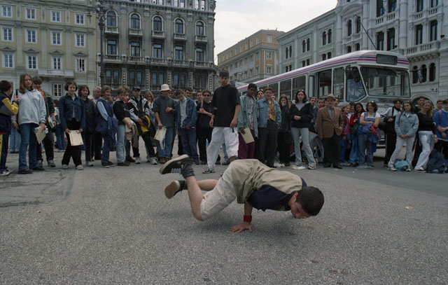 Piazza Unità, bambini, giovani, motorini, Lloyd Adriatico, vigili urbani, "Guida la tua vita", municipio, casco, breakdance.