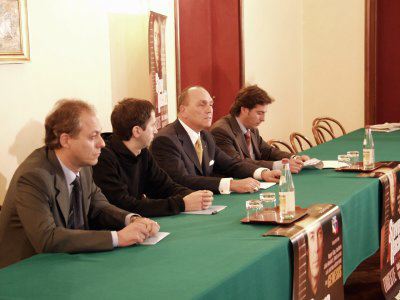 L'assessore comunale Maurizio Bucci assieme all'assessore regionale Sergio Dressi e Steve Hackett durante la presentazione del concerto.