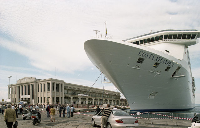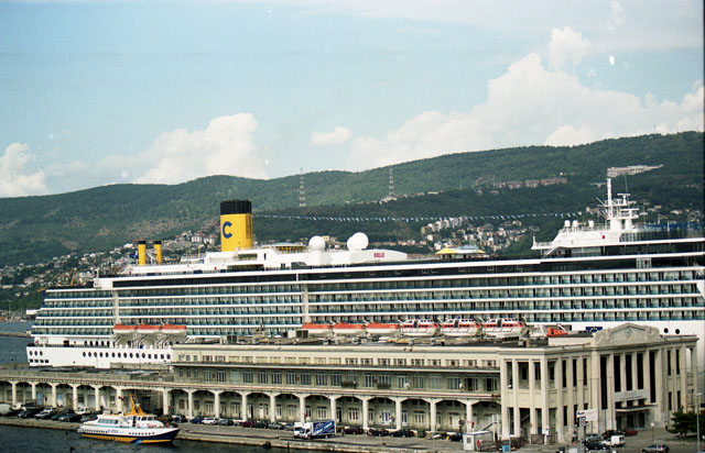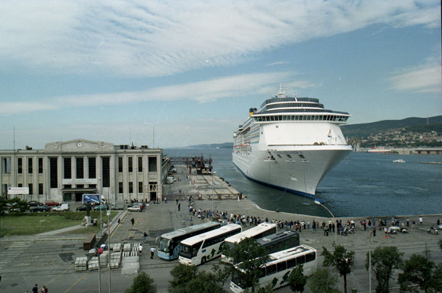 Stazione marittima, nave crociera, Costa Atlantica. Fuochi d'artificio, rive di Trieste, notturni, pescheria, foto artistiche, turisti, pullman.