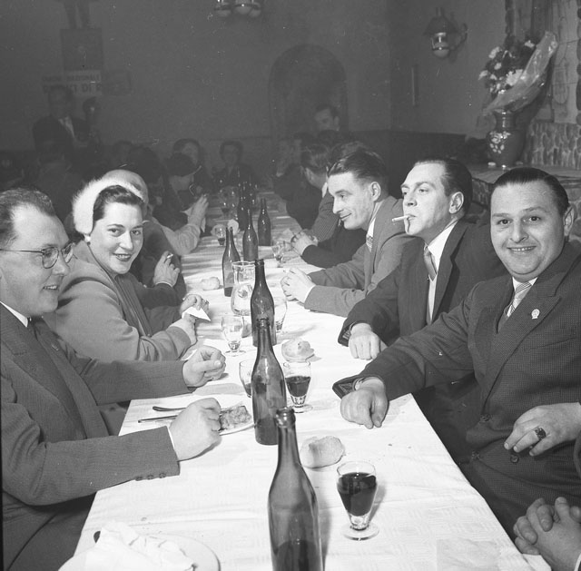 L'Unione nazionale italiana reduci di Russia di Trieste festeggia il rimpatrio del capitano Guido Musitelli, ufficiale triestino del 3. Reggimento artiglieria alpina della Julia, rientrato a casa dopo dodici anni di prigionia in Russia. Il fotogramma n.4 ritrae, fra gli altri, il fotografo Ugo Borsatti.