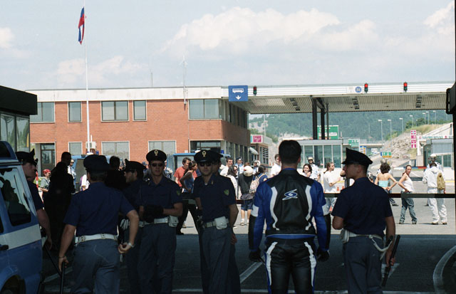 Confine, valico Fernetti, centri sociali, polizia slovena, code, file, automobili, turisti, Miljca. Tononi, Menia, Lippi.