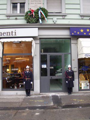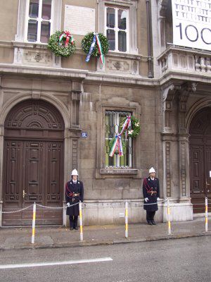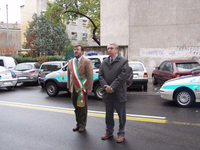 L'assessore Fulvio Sluga ed il consigliere Silvano Magnelli commemorano con corone d'alloro le targhe ai Caduti del '53, ai Caduti del 5 maggio '53, la targa Beltramini '45, le targhe ai Caduti antinazisti del '44 ed ai 41 martiri antifascisti del '44